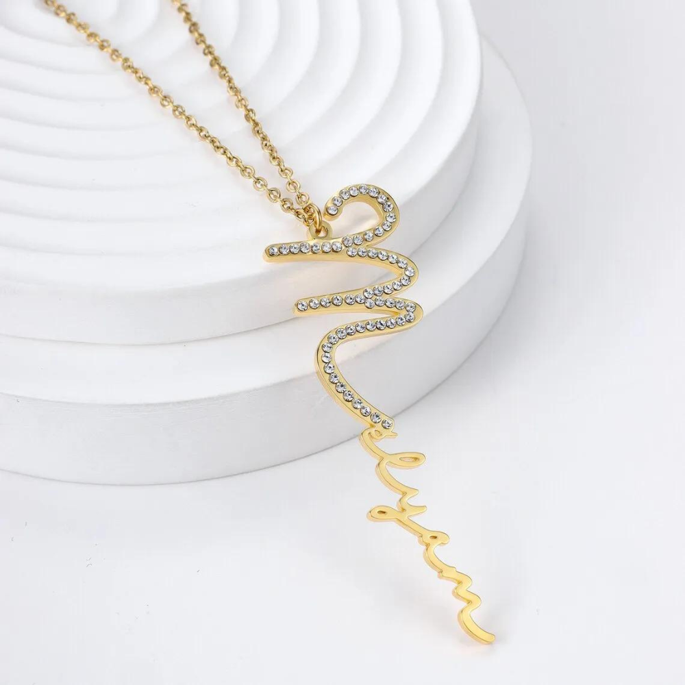 This Vertical Signature Diamond Name Necklace is a stunning and unique expression of personal style. The diamond adds a touch of sparkle that will make you stand out and the signature name will ensure your look is distinct. Perfect for yourself or a loved one, this is a statement piece that adds a total of style to any outfit.