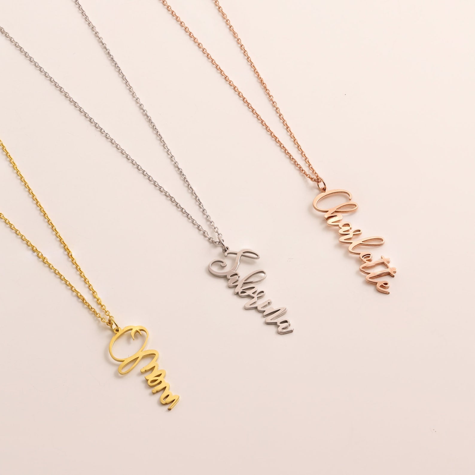 Our solid gold plated/silver name necklace in vertical style is for you if you like to feel different than others! This personalized name necklace is elegant and chic, just like you! ☺️ Our must-have name necklace will be your favorite personalized gift piece for your loved ones. Then what are you waiting for? Take a look at this beauty! 🍀
